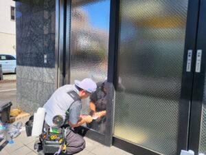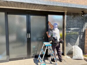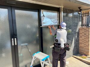 窓ガラスの清掃を済ませてから、窓ガラス全体に水を噴霧して貼り付け作業を開始していきます。