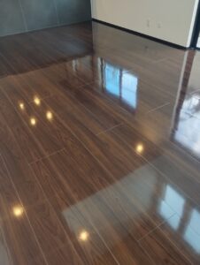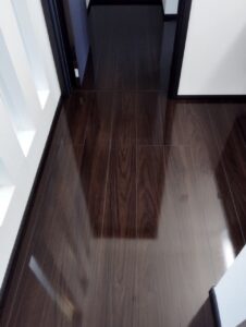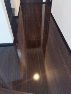 紫外線劣化や経年劣化によるフローリングの変色を抑え、擦り傷なども付きにくいのでフローリングをきれいな状態で保つことができ、コーティング後は水分を寄せ付けないので水拭きなども可能になります。